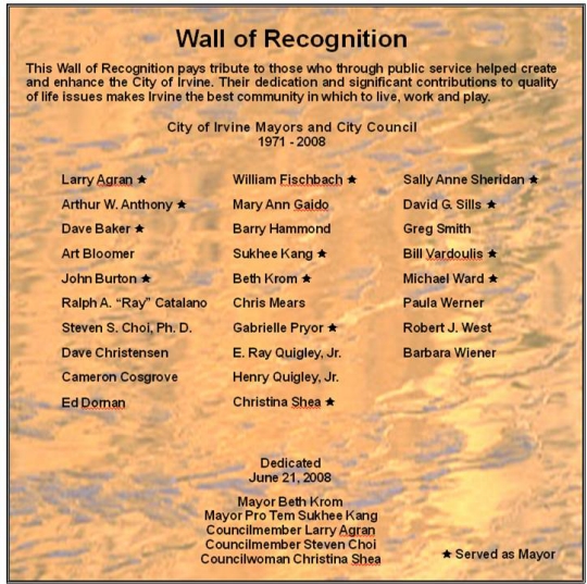 | Wall of Recognition | | | John Burton | | | City of Irvine Mayors and City Council 1971-2008 | |  | | | John Burton served on Irvine City Council as follows: 1971-1978 . He served as Mayor as follows: 1973-1974. |